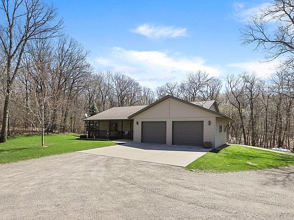 An amazing walkout rambler perfectly set on a private 19 acre piece of heavily wooded land. The driveway invites you into a home that features over 2600 finished square feet offering vaulted ceilings, custom cabinetry, granite countertops, Andersen windows, new flooring and a 14x12 sun room to enjoy the views and wildlife.Lower level provides a large family room, 2/4 bathtoom with tiled shower and 2 oversized bedrooms. Walk right out to your nice backyard and onto the many walking trails through the woods. The 26x26 attached garage is insulated, finished painted & trimmed. The 32x64 shed is home to a 32x32 heated workshop and the back half is cold storage. You won't be disappointed, the pride in ownership shines in this one owner home!
