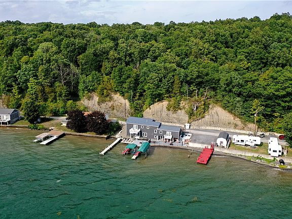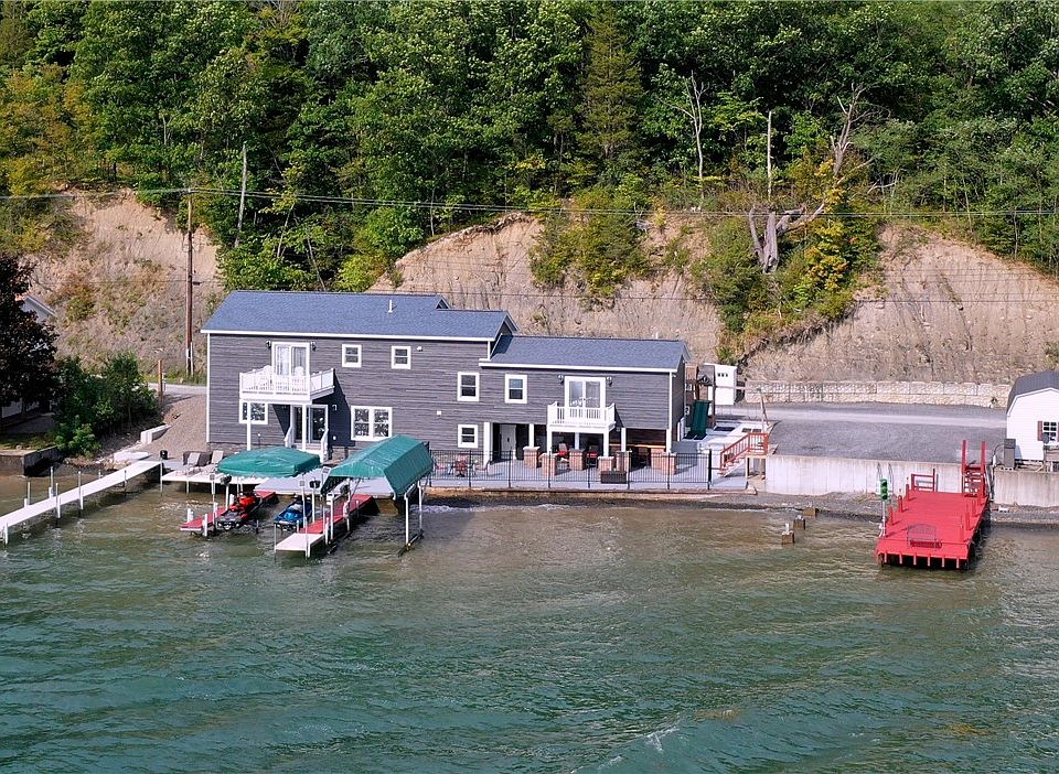 1653 Honoco isn't just a new home; it's a rare opportunity to own a brand-new, modern retreat on the shores of Cayuga Lake. This stunning contemporary residence, finished in 2025, is ideally located on the east side of the lake, placing you at the perfect midpoint for spectacular lake and sunset views and easy access to local restaurants and wineries on the lakeside. Step inside the spacious 2,746-square-foot home (agent measured) and be greeted by a bright, open layout designed for effortless entertaining. The gourmet kitchen is a true masterpiece. Imagine gathering around the 14-foot island with seating for up to 15 guests, all while surrounded by premium appliances, elegant polished porcelain floors, and 38 feet of gleaming quartz counter tops. This is more than a kitchen—it's the heart of the home, a space where memories are made. The property embraces the lakefront lifestyle with 165 feet of private shoreline. Whether you're relaxing with a favorite beverage at the covered outdoor bar, hosting a BBQ on the patio, or enjoying a day on the water from your dock (s), this property offers spaces for every activity. The master suite's private balcony provides a serene escape with panoramic, 180-degree views of the water. Built for year-round comfort, the home features a modern HVAC system with in-floor radiant heat for a cozy warmth in the colder months and Mitsubishi mini-splits for a refreshing cool during the summer. This prime location offers the perfect blend of comfort and convenience, just south of the charming Village of Aurora, a short drive from Ithaca, and an easy in and out via RT90, Rt 81, or the NYS Thruway. With ample parking for over a dozen vehicles, a large detached shed, and setup for generator hookup, this property is both beautiful and practical. This portion of the road has recently been paved. Don't worry about painting, the wood siding is coated with a 30 year enamel. Experience the best of lakefront living at 1653 Honoco. Note: Public information notes built in 1955, 1221 sq ft, 3 bed, and 1 bath which was the original, nothing of this remains.
