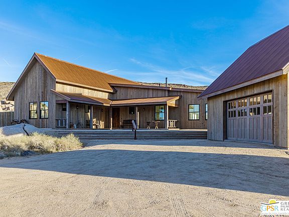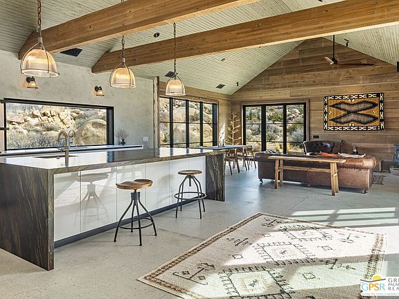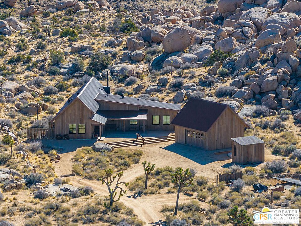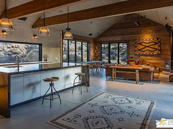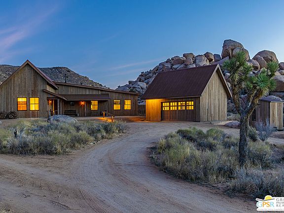 Blending into the boulders, this custom off-grid home is nothing short of rustic paradise on 10 acres. Newly constructed with utmost sensitivity for land and views, it borders the preserved Sand to Snow National Monument in coveted Pipes Canyon and rewards from every stunning angle. Restrained minimal architecture and honest craftsmanship show reverence for a timeless region the Serrano people called "Rocky Place." Through the wood gates, past the undisturbed Joshua Trees, the welcoming sight of a hand-stained cedar exterior and steep rooflines covered in Corten steel conjure late 1800s homesteads of the mining town of Bodie. Airy interiors reflect the rugged-chic spirit of Sundance Lodge, revealing authentic details from salvaged beams to cedar-plank walls. Through steel-framed windows, sunrises and sunsets paint the sky. Evenings beckon with a book by the wood stove. Open dining adjoins top-of-the-line kitchen with prep pantry, Italian cabinetry and wood-look leathered Quartzite island. Dual ensuite bedroom suites open to private patios and a 2-car garage with HVAC is flex space for a studio or home gym. Rest in the deep shade of the porch or hike and bike into pristine terrain piled with high nature's displays. Bird and animal life share these classic western landscapes in a peace-laden pocket where a global arts scene soaks up the sacred energy. New private solar, septic and high-volume well serve this independent property in a perfect balance of land-honoring and luxury.