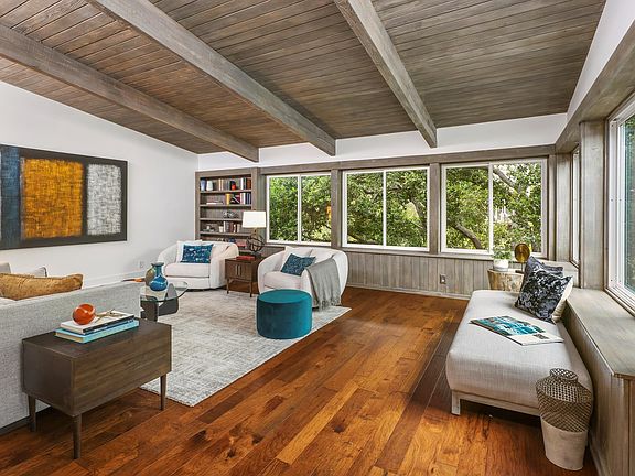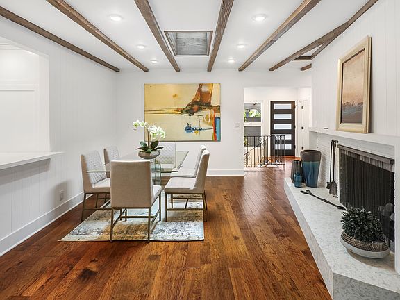 Enter through the front gate to an enchanting lush setting with views of beautiful California oaks providing a sense of privacy and tranquility within a short distance to Palisades Village and the beach. This three bedroom home has a remodeled kitchen with SS appliances and a pass through to the dining area for easy entertaining, as well as a sunny breakfast room, ideal for that morning cup of coffee. The dining area has a fireplace, as does the den on the lower level. The spacious living room has a vaulted ceiling and many windows, creating a sense of living in a treehouse. The primary suite on the lower level has lovely views of the trees and a remodeled bathroom with double sinks. A second bedroom/bath is also on the lower level. The 3rd bedroom/bath is located on the first floor. The den, currently being used as a children's play area, opens to the patio. An office alcove on the lower level is ideal for working at home. There is a direct entry two car garage wired for Tesla charger and a large laundry room. Ample storage, engineered wood floors, central heat are a few of the amenities.