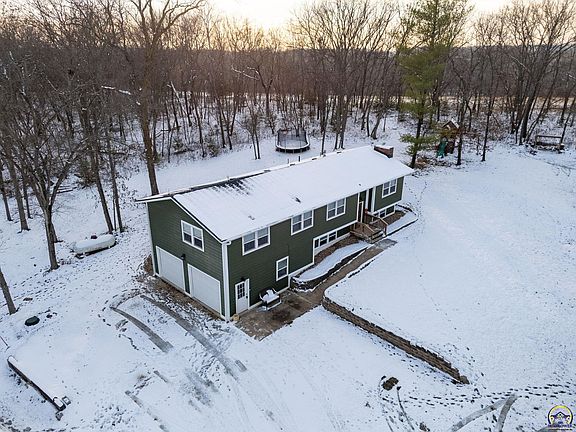 Secluded setting offering Privacy and Tranquility, All Setting on 8.35 acres This 5 bedroom 3 bath home has 2512 sq foot and over looks a large stocked pond. Includes a 30 x 45 ft shop with concrete floors and electric. The house has an oversized 2 car garage Also has includes a 512 sq ft tiny home featuring living room, 1 bedroom, full bathroom for extra needed space for an Air BNB or In-laws or that teenager that needs their own space. The main home has a New Roof & Newer Furnace. The family room has a Fireplace with an insert that will warm the whole house. Surrounded by mature timber and set back off the road. just 15 minutes from Lawrence.