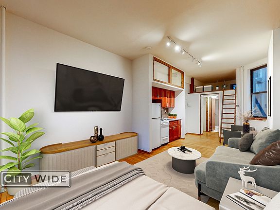 This is such a cool space! The living area will fit a queen bed, sofa, and desk/table.. There's a loft space with ladder access for additional storage or chill space. There are two closets PLUS additional cutout storage above the kitchen. So much space storage space! The ceilings are extra tall, making the apartment feel even roomier.