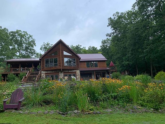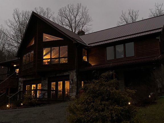 The definition of peace and tranquility. This spectacular home is situated on over 42 acres with a 2.5 acre pond, surrounded with natural stone decorative border as the highlight of the property. The property is private and secluded, but still provides city water and easy access by way of a private, well maintained gravel drive. The recently renovated home boasts 3 bedrooms, all of which have their own bathroom. The main level of the home features a spacious open floor plan with newly updated kitchen with all appliances and quartz countertops and tile floors, dining room with hardwood floors, large living room with stone hearth and woodburning stove, cathedral wood adorned ceilings with new upscale ceiling fans, wood floors, massive windows with breathtaking views of the mountainside and pond, large main primary bedroom with wlk in closet, cathedral ceiling and private bath complimented with a tile wlk in shower, additional guest bedroom with access to the common bath, wlk in closet and cathedral ceiling with natural wood accents. The lower level of the home boasts an enormous 23x26 bedroom with private bath and large closet, which could easily be utilized as additional living space (gathering, game room, office, home gym, etc.) if the third bedroom isn't required. Nearly all rooms have an entrance to the decks that overlook the pond. The property features a hot tub, outdoor shower, garden space, storage building/barn, choices for heating are wood, propane and electric, central air conditioning, septic system, wood siding with stone accents and metal roof, two car integral garage, wi-fi available and Starlink is an option at this location. You don't want to miss your opportunity on this one! Qualified buyers schedule your tour today!