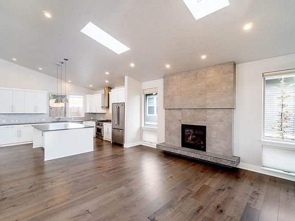 This contemporary home in Northwest Crossing offers clean lines, vaulted ceilings, & luxury finishes. Rich wide-plank wood floors throughout make this single-level home feel warm, while tall windows bathe the living areas in light. The great room at the front of the home offers views of the neighborhood, & features skylights & gas FP. The well-appointed kitchen boasts quartz counters, large island w/ breakfast bar, white cabinetry, & Jenn-Air applcs. A generous dining area off the kitchen is perfect for entertaining family and friends while you cook. The hallway off the living room offers access to 2 guest bedrooms and a full bath, & can be closed off w/ a barn door for extra privacy. Nicely separated Master features a stunning bathroom w/ tiled w/i shower and access to the w/i closet. Outside, find a partially fenced patio w/ alley access. This home also features a large laundry room, 2-car garage, and is close to Discovery Park & all the amenities Northwest Crossing has to offer.