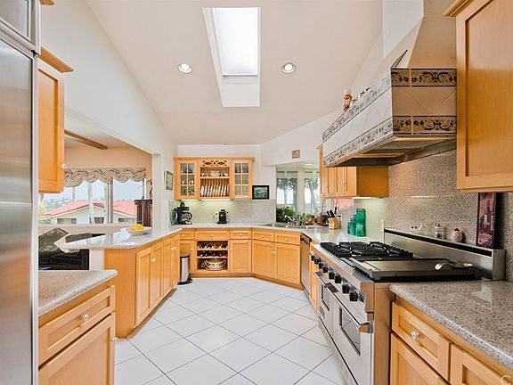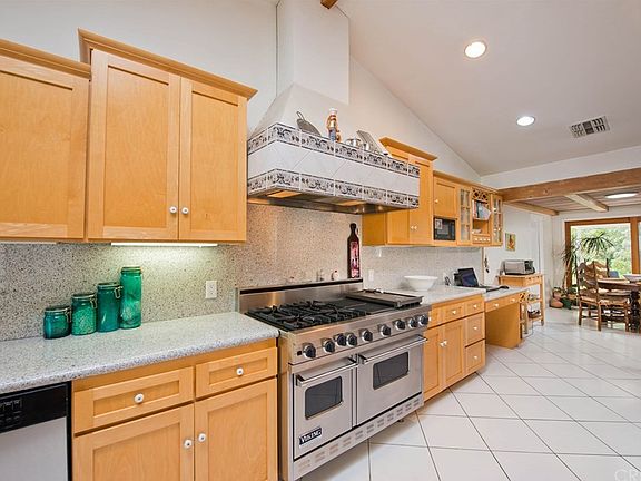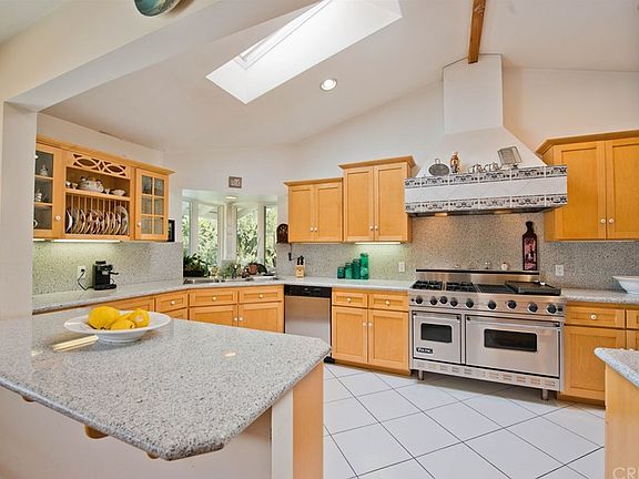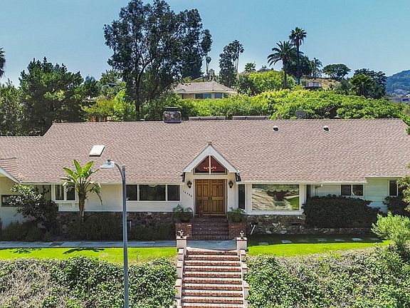 Embraced with mountain top views and tucked above the street to enjoy its complete privacy! This expansive single level residence is highlighted with gleaming wood floors, loads of natural light, wood beamed ceiling details and wonderful open living spaces. Enjoy the expansive and updated chef's kitchen with custom cabinetry, breakfast bar, granite counters, double Viking range, Sub Zero refrigeration and attached breakfast room. Encompassing three ensuite bedrooms that include wonderful master with sitting area, two walk in closets and spa styled bath with jetted tub, oversized shower and separate toilet room. The fourth bedroom has been converted to a party sized formal dining room with bay window, built in bar and overlooks the beautiful mountain views or can easily be returned to its original bedroom space. At the heart of the home is its captivating dual sided brick fireplace that separates the formal living area and family room with walls of glass that overlook the serene covered patio retreat and expansive rear yard, beautifully forested with mature landscape and sprawling pastoral-like grassy play. Situated in the highly acclaimed Lanai School district with easy Westside access, an opportunity you will surely not want to miss!