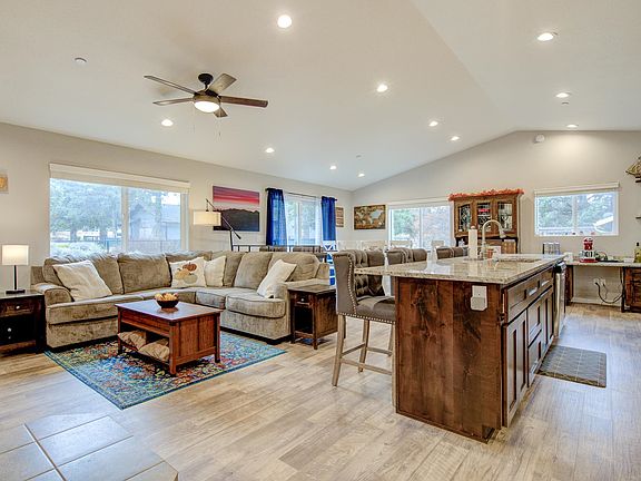 Huge eat-at islandLarge windowsWood stoveVaulted ceilingOpen floor planAbundance of recessed lightingGranite countertops
