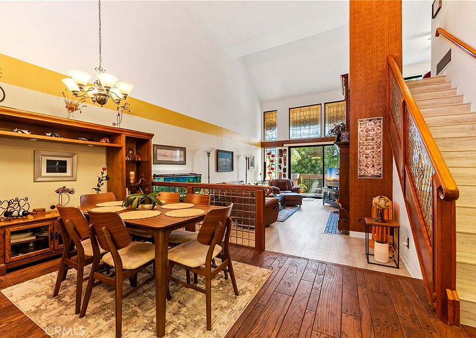 Clark Terrace offers a one-of-a-kind setting with towering pine trees, cascading waterfalls, and lush landscaping that feels like a serene escape in the city. This top-floor condo includes 2 bedrooms, 2 bathrooms, a spacious loft, and two gated parking spaces with an EV outlet. The living room boasts soaring cathedral ceilings, custom stained-glass, wood accents, and a dramatic gas fireplace with an antique mantel. The spacious dining area also features a built-in wet bar with extra storage.