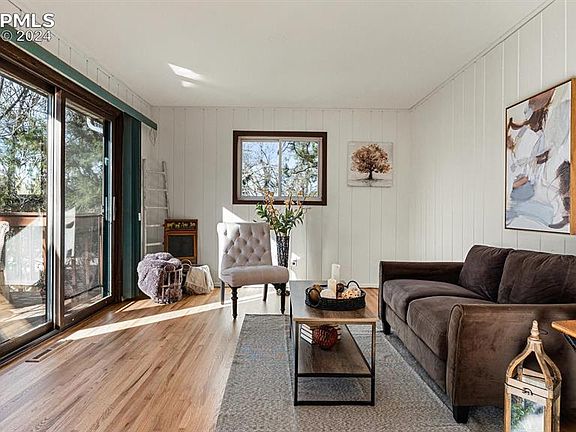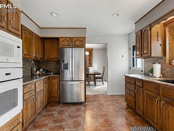 Beautifully updated 4BR/3BA, ranch style home located in Falcon Estates on a fabulous 1.06 acre fenced lot w/mature trees & shrubs, peaceful stream & pond w/waterfall that hosts beautiful lilies & fish. Security system for peace of mind. Fresh interior paint & new carpet. Gorgeous, refinished hardwood floors on the main level. Bright, open floor plan, great for entertaining family & friends! The tiled Entry leads you into the Living Rm that features a large view window w/window seat & wood-burning brick fireplace to cozy up on chilly nights. The formal Dining Rm offers a built-in buffet hutch, slider to the backyard patio, & kitchen access for convenient food service & clean up. The Walk Out Kitchen features a tile floor, pantry, & wood cabinets w/granite countertops. Appliances incl a cooktop, dishwasher, built in microwave, oven, & French door refrigerator. The Family Rm provides another comfortable gathering space w/lighted ceiling fan & dual sliders to the backyard deck. The Main Level Primary BR boasts a lighted ceiling fan, dual closets + small walk-in closet, & adjoining Shower Bathroom. BR2 shares a Full Hall Bathroom w/ vanity & tiled tub/shower. The Finished Basement hosts a Family Rm w/wood chip burning stove, 2 BRs (one is currently an office) & Shower Bathroom. There is a Laundry Rm w/ tile floor, folding table, upper/lower cabinets, & washer/dryer, & a Craft/Utility Rm w/built-in shelving. The workshop off the garage incl a Kenmore Frostless Freezer & refrigerator. Oversized 2-car garage w/door opener. Storage shed & greenhouse for gardening, tools & toys. The backyard oasis hosts several entertaining areas incl an expansive deck, concrete patio, covered flagstone patio, & children’s swing & playhouse! This delightful home is situated in the highly desired D-20 school district. Falcon’s Landing & Academy Blvd are mins away for convenient shopping & dining opportunities. For outdoor enthusiasts, it's an easy drive to Ute Valley Park & Blodgett Peak.