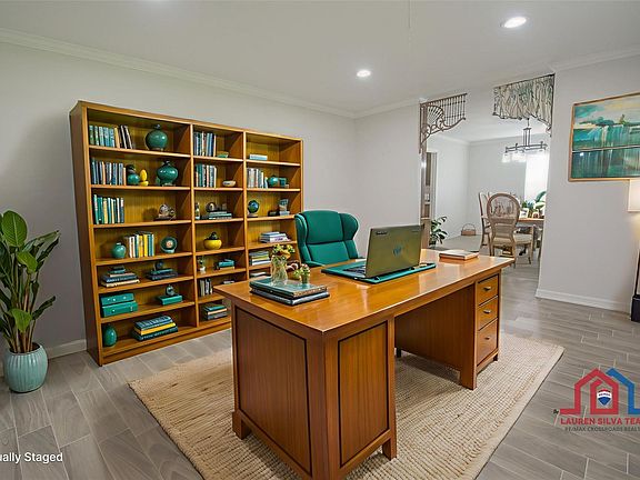 Wood-burning fireplaceLarge oak treesFenced yardFormal denWood-like flooringCustom-built display caseFormal dining