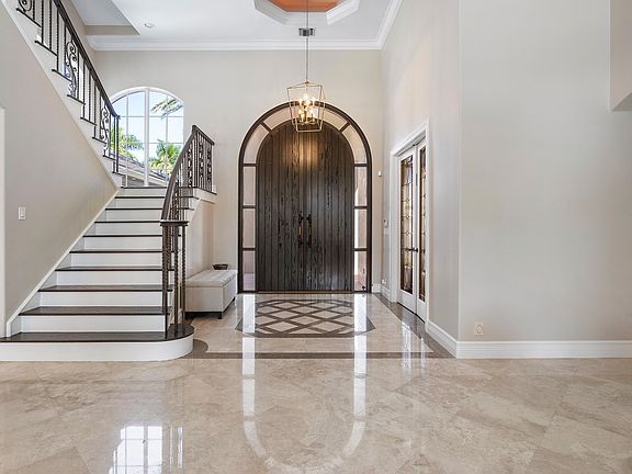 This stunning furnished home in prestigious Royal Palm Yacht club offers a prime location on the golf course with panoramic views. The home has been remodeled with exquisite taste & attention to detail, featuring high ceilings, impact glass windows and doors, and a new roof installed in 2020. The kitchen is a chef's dream with calcutta marble countertops, viking gas stove, sub zero refrigerator and large wine storage. The master suite is on the first floor and features wood flooring and a spa-like bathroom w/ 2 water closets The downstairs also boasts a rich wooden paneled library. Upstairs are 3 ensuite bedrooms and cozy loft,area The backyard is an oasis of relaxation and entertainment, with a large covered loggia, heated pool, spa & summer kitchen