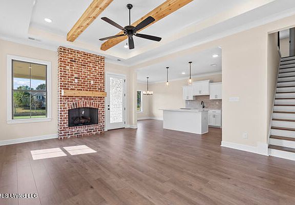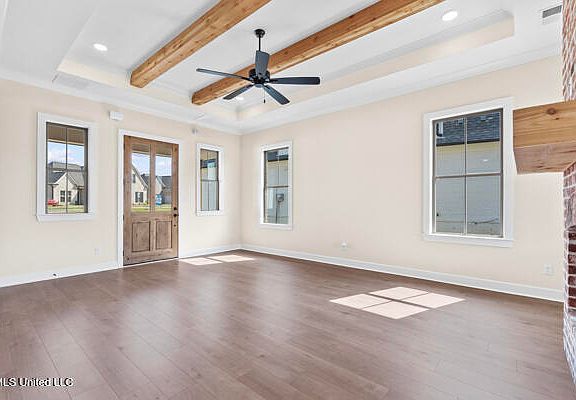 Builder is offering up to $12,000 in concessions to use towards buyer closing costs. and/or upgrades. Custom finishes throughout on this waterfront home in Southaven. Striking elevation with cathedral front porch with cedar design and brick flower beds. Walk into a gorgeous great room with cedar beams and center fireplace with ceiling height brick work. Kitchen features island with no sink for more space, stainless steel appliances, gas stove, custom cabinets, tile back splash, and walk in pantry. Primary suite features large bedroom with tray ceiling with cedar design, double vanity, walk in shower with ceiling height tile, and walk in closet with wood shelving. Also downstairs in half bath, laundry, and lockers. Oak wood stairs take you upstairs to 3 bedrooms, a full bath, and walk in attic with stairs for third floor storage. Relax on your large covered porch with water views. Other features include custom tile throughout, soft close drawers and doors on all cabinetry, and high efficiency HVAC system. Why settle for builder grade finishes when this beautiful home awaits you