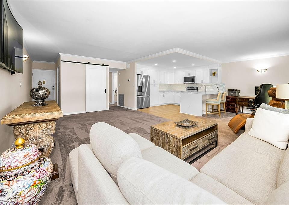 Effortless Florida Living in the Heart of Penthouse Groves – 55+ Community Welcome to this beautifully fully revamped first-floor condo offering 1,025 sq ft of inviting living space in the highly sought-after Penthouse Groves active community. This spacious 1-bedroom, 1.5-bath residence blends comfort, style, and convenience in one exceptional package. Step into a bright and open floor plan featuring a generous great room with combined living and dining areas, plush carpeting, and new impact windows that bathe the space in natural light. A large walk-in closet adds practical storage, and beauty and elegance to the open plan. The stylish kitchen is a standout, boasting all new cabinetry, coordinating tile backsplash, a stainless steel sink, and modern stainless steel appliances including a 2024 refrigerator, ceramic cooktop double oven, and dishwasher enhancing this dream kitchen. Retreat to the generously sized primary suite, again with new plush carpeting, a ceiling fan (2024), and a second walk-in closet. The updated ensuite bath showcases a walk-in shower with glass door, designer tilework, and an extended vanity with undermount sink, plus a nearby linen closet for additional storage. Guests will appreciate the conveniently located half bath, finished with tile flooring and a sleek single vanity. A hallway closet houses a top of the range washer and dryer combined (2024), making laundry a breeze. Additional features include fresh interior paint (2024), a new water heater (2024), new a/c (2024)