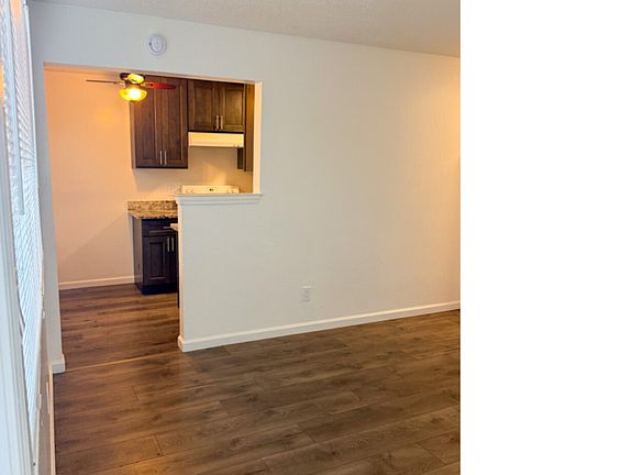 Long granite counter spaceNewer appliancesDark wood laminate flooring