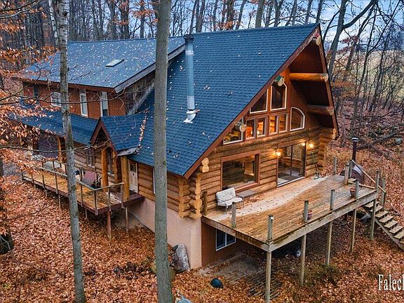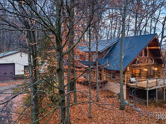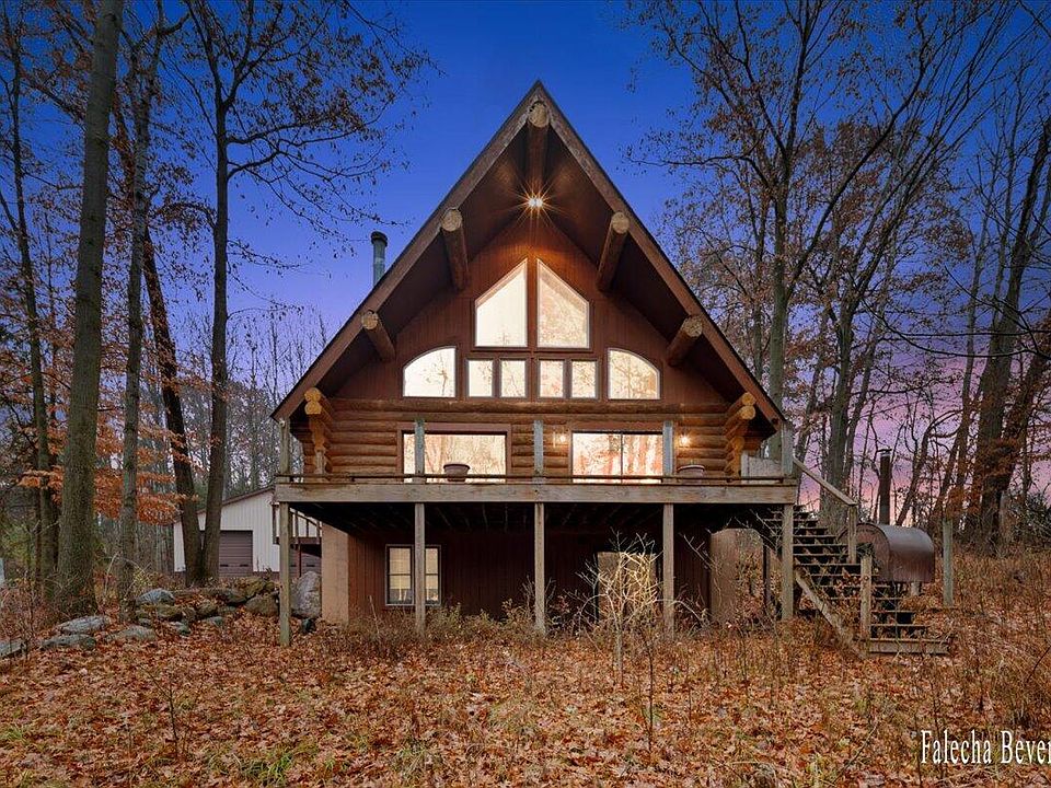 Fall in love with this spectacular Engelmann Spruce Log Home!! Situated on 2.37 secluded acres, it boasts 3 stories of living space and a 40' x 48' pole barn. The entry opens to a living room with fireplace, floor to ceiling windows, and a slider leading onto a large deck with beautiful views. The kitchen is flanked with a large formal dining area on one side and an ample breakfast area on the other. A half bathroom with laundry is adjacent. Up the stairs you will find a loft, primary with ensuite with dual vanities, an expansive bedroom/bonus room, full bath and connected third bedroom. There is an attached garage with stairs leading to a full walkout basement, ready to finish out a family room, bedroom and full bath. The property backs up to several hundred acres of state land to enjoy and explore. Call for a private tour of this stellar home today!