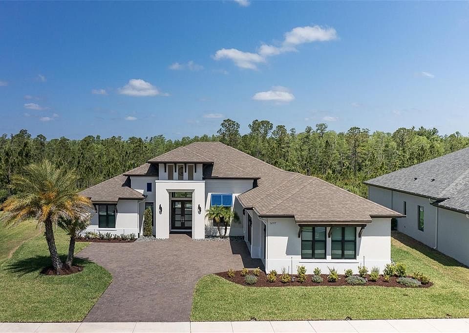Luxurious Custom-Built AR Homes Retreat on Private Conservation Lot Tucked away on a serene cul-de-sac and backing to peaceful conservation and pond views, this stunning custom-built AR Homes residence offers the ultimate in privacy, luxury, and thoughtful design. Boasting 3 spacious bedrooms, 3 full bathrooms, a versatile bonus room, and a dedicated office/den, this home seamlessly blends elegance and comfort. Step inside to soaring custom ceilings with rich wood accents, beautifully designed tile flooring, and striking custom lighting that enhances every detail. The heart of the home features a gourmet kitchen with sleek quartz countertops, top-tier cabinetry, and designer finishes throughout. The pampering owner’s suite is a true retreat with dual custom walk-in closets, a spa-like bath including an oversized walk-in shower, a relaxing soaking tub, and custom vanities that elevate everyday living to include a Seura Hydra waterproof in wall T.V. A guest bedroom enjoys its own en suite bath, perfect for visitors or multigenerational living. Function meets style in the expansive laundry room with a huge walk-in closet and built-in mudroom space just off the generous 3-car garage. Step outside to your private oasis—a sprawling screened lanai with elegant travertine floors, lush landscaping, and a sparkling custom pool with sun shelf and spill-over bowls, all perfectly framed by serene pond and conservation views. Enjoy the custom summer kitchen complete with custom hood & gleaming granite or enjoy relaxing by the custom gas fire-pit. This exceptional property offers peace, privacy, and a truly elevated lifestyle. Don’t miss your opportunity to own a custom-crafted masterpiece in one of the most desirable settings available. This fabulous home boasts many recents upgrades: new sod, upgraded landscaping, fresh mulch, all new lights/fans throughout, reclaimed water for irrigation, wood ceiling on lanai, custom closet organizers, gas pool heater & so much more! Enjoy all that BEXLEY has to offer its residents: resort-style amenities just a short walk or golf cart ride away. Enjoy the clubhouse with an on-site café, 3 swimming pools, fitness center, game room, walking trails, dog park, bike park, & sports fields. Top-rated Bexley Elementary is within the neighborhood, along with the Bexley Hub, featuring restaurants, a bar, nail salon, and services surrounding a green space for outdoor gatherings. Located on SR 54, just off the Parkway with easy access to Tampa International Airport & downtown Tampa and a short drive to beautiful local beaches! Perfection!