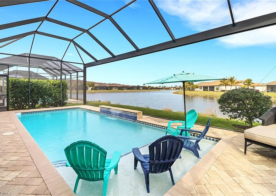 One of the most spectacular long lake views in the active adult community of Valencia Bonita. This home features 3 bedrooms, den and 2 and 1/2 baths. So many upgrades. Crown molding, upgraded painting, dry bar, custom closets in the master bedroom. Upgraded cabinet lighting along with upgraded countertops in the kitchen and baths. In the past 2 years the refrigerator, washer and dryer have been upgraded. New carpet in 2024 in all the bedrooms. The front exterior has a screened in entry area along with professional landscaping and lighting. The heated pool boasts a picture frame screen to enhance your lake view. Electric hurricane shutters allows for lanai furniture to remain outside during a storm, while keeping the rain out. In the garage, there is a water filtration unit and a mini split to keep the garage at a comfortable temperature. A whole house generator offers peace of mind. Valencia Bonita is close to the beaches, grocery stores and other shopping. 25 minute ride to the airport. The community has a life style director for a variety of fun and entertaining events that are held in the 45,000 sq ft clubhouse. This 55+ community has 3 pools, pickleball courts, tennis courts and bocce. A very desirable feature is the on site dining and bar.