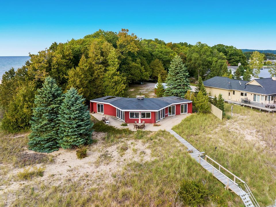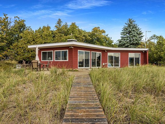 The ICONIC red house at the end of Starkey Point in Arcadia with 180 degree water views of Lake Michigan AND Arcadia Lake could be yours! This is a home with unparalleled views; designed to take in water views no matter where you are in the home. The interior exudes mid-century charm, with a unique and show-stopping stone fireplace. Thoughtful updates have been made to the home throughout the years, but has still kept its original charm. Once you step outside stairs will lead you down to Arcadia Lake and the channel that feeds right out to Lake Michigan. There is an option for a dock to be installed as well. The major selling point of this house is the private frontage on Arcadia Lake as well as shared Lake Michigan access- shared Lake Michigan beach access is just steps away with a path located right at the house. The view across the channel is protected and cannot be developed. This is the most idyllic setting in the most impressive location with various wildlife viewing; a bird watchers paradise and the most jaw dropping sunrises and sunsets. This property is being sold furnished and ready for you to move right in and make it your own! Arcadia is home to the famous Arcadia Bluffs Golf Course and about a 30 minute drive to Beulah, and 45 mins to the Sleeping Bear Dunes National Lakeshore!