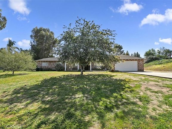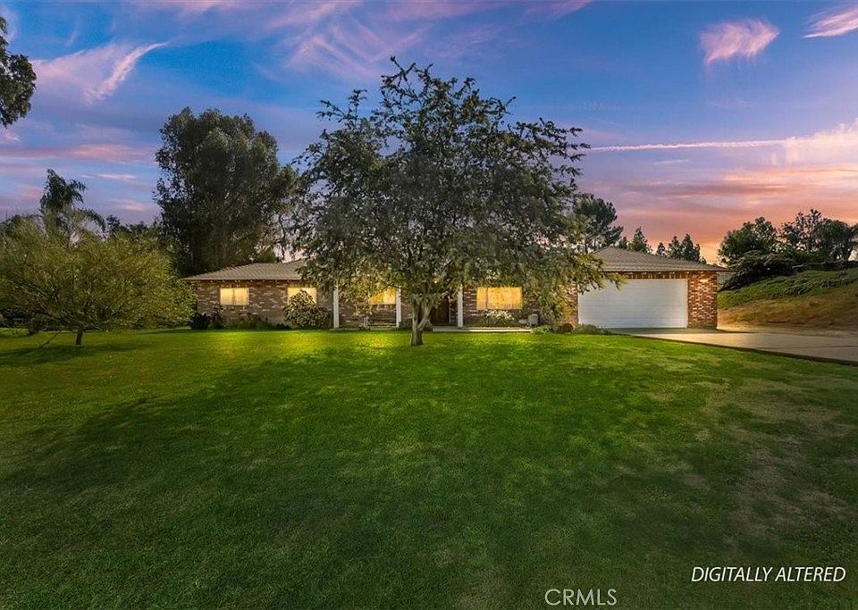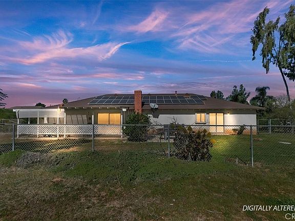 Beautiful single-story Ranch-style brick home with a charming covered front porch, located in the desirable Woodcrest area on nearly a full acre of usable, level land. Double-door entry welcomes you into a warm and inviting family room featuring stunning wood-beamed tongue-and-groove ceilings and a cozy wood-burning fireplace. Tile and engineered wood flooring throughout. Living and dining rooms offer abundant natural light through large windows. The kitchen is open to the family room and includes a spacious walk-in pantry, perfect for entertaining and everyday living. Convenient indoor laundry room. This home offers 4 bedrooms, 2 bathrooms, and approximately 2,300 sq ft of living space. The spacious primary suite features a large walk-in closet, dual sinks, and a shower enclosure. Enjoy mature trees, a covered back patio, RV parking, and fully paid solar to help keep energy costs low. Plenty of room for a shop or ADU. Ideally located close to shopping and freeways—this property offers space, comfort, and endless possibilities.