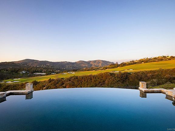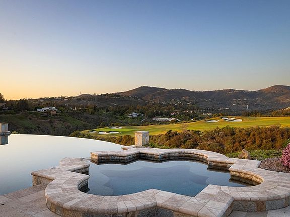 This impeccable designer's own home, curated for the most discerning buyer, offers indoor-outdoor year round entertainment with stunning views. Perched above the 9th hole at the Crosby Golf Course, this property was completely remodeled by seller in 2024. The spacious floorplan features 3 ensuite bedrooms, plus an option for guest accommodations in the office/den as well as an optional fourth bedroom, currently functioning as a chef kitchen. Featuring a grand spa-like owner's suite, a cozy family theater, an expansive great room with open kitchen and dining, chefs kitchen and pantry, designer luxe finishes and upgrades throughout. The all useable flat lot boasts a stunning infinity-edge pool, jacuzzi, fire pit, custom built-in BBQ, outdoor covered dining area and dedicated pool bath, all perfectly positioned to take in the spectacular North-Eastern views of the golf course, mountains, and dazzling sunsets. The property is completed by a grand entry circular driveway, a spacious 3-car garage, fully owned solar panels, offering energy efficiency and convenience. This home is designed for luxurious Rancho Santa Fe living and entertaining. The recent remodel include4s grounds which have been relandscaped for drought tolerant and a maintenance free lifestyle. The Crosby Community is one of the ultimate guarded and gated security and fire safety oriented neighborhoods in Rancho Santa Fe, with club house, community tennis, walking trails, Olympic pool and spa, pickleball and exceptional community events.