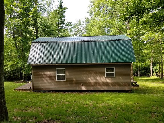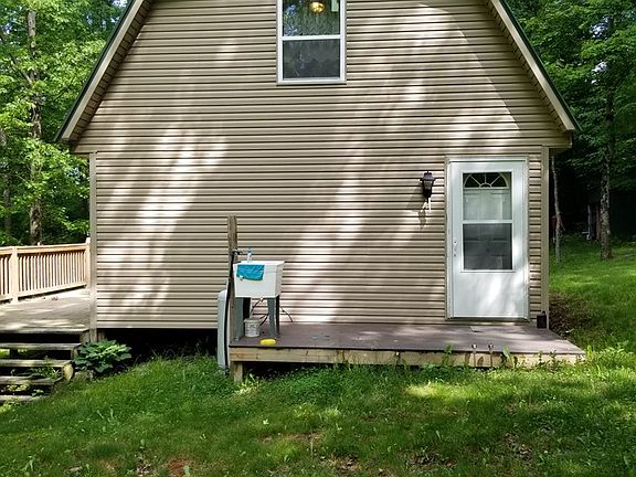 Great place to relax in the outdoors. This camp has a kitchen/dining area, living room, bedroom and bathroom on the main level. The upstairs is an open bunk room to accommodate your family and/or friends. Most furnishings come with the camp. Large 30x10 deck runs the length of the camp and another 6x12 deck on the side. Also included is the large pavilion with picnic tables, grill, and fire ring, along with a shed, generator, lawn mower, shower with pump, and 2 water tanks. A stream runs through this 10+ acre property. This camp is ready to move in and enjoy.