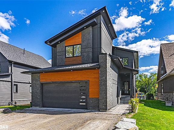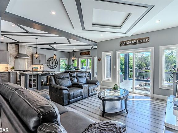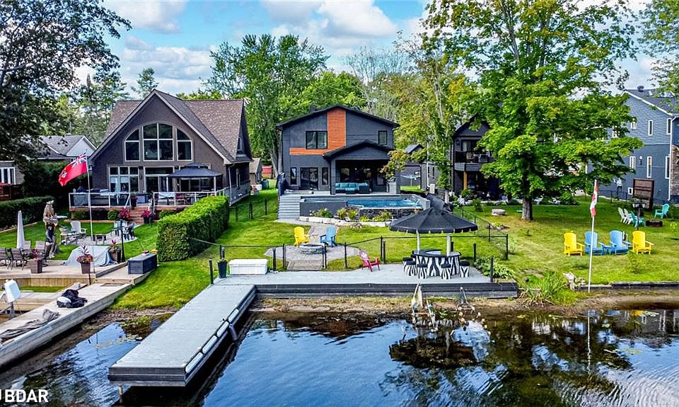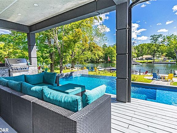 STRIKING ARCHITECTURE, WATERFRONT SERENITY, & ENDLESS LUXURY - A CONTEMPORARY MUSKOKA HAVEN WITH OVER 2,800 SQ FT OF STYLE! Welcome to a waterfront retreat with 50 feet of direct shoreline on the Trent Severn Waterway, where every day feels like a Muskoka getaway. Surrounded by lush forests, lakes, hiking trails, and golf courses, this location offers year-round adventure, with the Lauderdale Point Marina and Resort just steps away for waterside dining and boating convenience. Only 15 minutes to Washago and 25 minutes to Gravenhurst, the property balances peaceful seclusion with easy access to daily essentials. Striking curb appeal is showcased by bold modern architecture with rare imported stone, while the driveway and attached double garage provide parking for 10+ vehicles and toys. The private, fully fenced backyard has been transformed into a luxury resort with a heated pool, bubbling hot tub, outdoor TV, firepit lounge, and an outdoor kitchen, all overlooking a private dock with a jet ski ramp and the charming “Zebra Bar,” a beloved landmark amongst the welcoming neighbours. Inside, 2,800+ sq ft of stunning living space offers open-concept flow, with a living area centred around a fireplace and a walkout to the deck, and a designer kitchen with an oversized island, professional gas stove, and custom lighting. The main level also features a versatile bedroom or office, a powder room, and a mudroom with garage entry. Upstairs, three bedrooms and a laundry room are enhanced by a flexible rec space, while the primary suite delivers a spa-like escape with panoramic lake views, a walk-in closet, and a 5-piece ensuite with a deep soaker tub and walk-in glass shower. Thoughtful upgrades, including dual 200-amp services, a Generac transfer switch, on-demand hot water, and a UV water treatment system ensure peace of mind for years to come. This is more than a #HomeToStay - it’s a Muskoka waterfront lifestyle of luxury, leisure, and unforgettable memories!