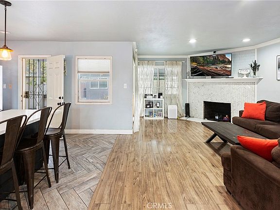 Property features an open floor plan with updated kitchen with quartz countertops and large island. Custom flooring and crown molding throughout, recessed lighting and spacious living room with wonderful chimney to enjoy with family and friends. Bathrooms have also been updated. 2 car garage attached at front with oversized concrete driveway for plenty of parking. The rear yard has block walls for privacy, concrete for easy maintenance and a storage shed that can been used as an office or bonus room. This pride of ownership home is centrally located and close to all including freeways, schools, shopping and restaurants.