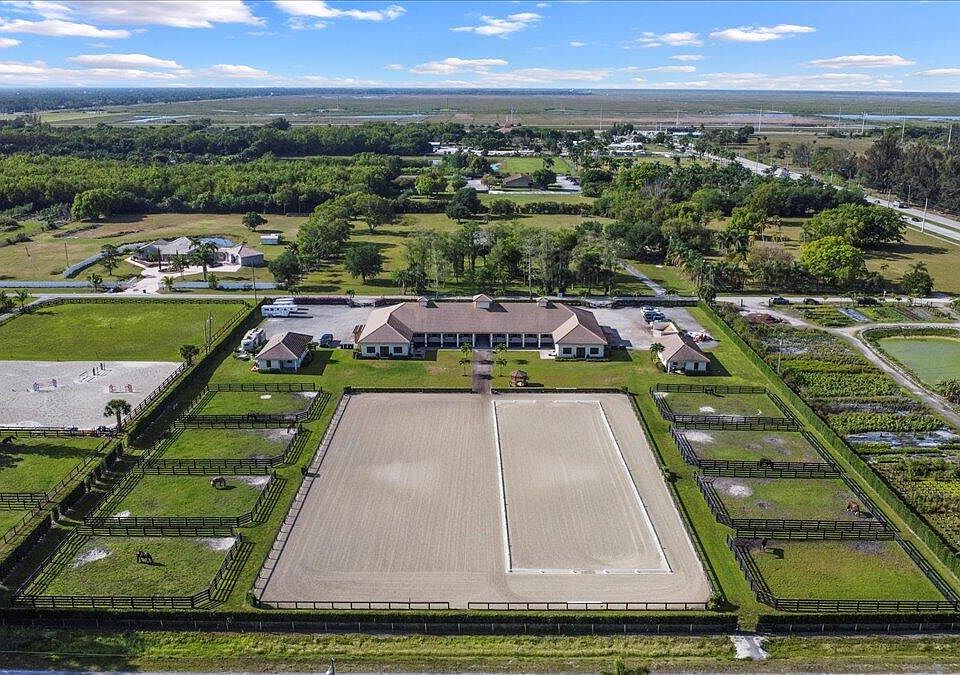 Located just a short drive to Wellington's horse showgrounds, this luxurious barn, built in 2017, is in impeccable condition. Situated conveniently on a paved road, the property offers a total of 24 stalls and 8 paddocks. Featuring 2 separate isles of 12 stalls each, with private access to premium amenities including an air-conditioned tack room, feed room, laundry facilities, a half bath, wash racks & 4 paddocks. The property is fully fenced with an automatic gate for security and ease of access, ample parking and shared use of a generously sized all weather arena with a covered viewing area. Additionally, this remarkable property also has two charming 2-bed, 2-bath cottages w/beautiful living arrangements, and 2 camper hookup spots for added convenience. A COVERED ARENA CAN BE BUILT! Surrounded by gorgeous palm trees and lush landscaping, the barn offers a picturesque ambiance.