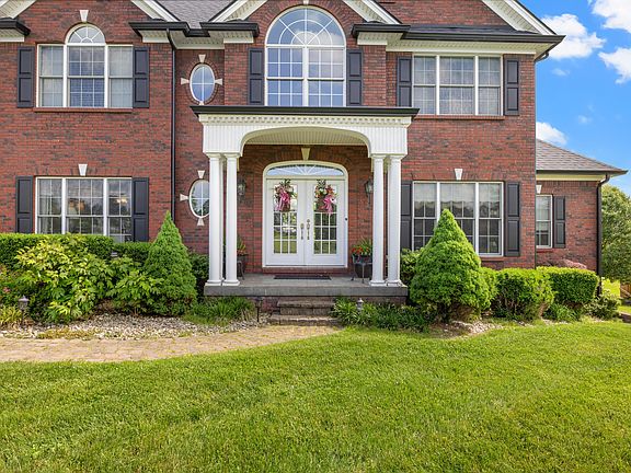 Elegant Estate with Luxurious Amenities on 3.41 Acres. This stunning home is the epitome of elegance, offering an array of upscale features and thoughtful design throughout. Step into the welcoming two-story foyer, which flows seamlessly into a warm and inviting great room complete with a gas log fireplace framed by custom built-in bookcases. At the heart of the home is the kitchen—a true family hub—featuring a spacious island with bar seating, smooth top range with built-in bookshelves, an oven with warming drawer, built-in desk, and ample windows that flood the space with natural light. Host memorable gatherings in the formal dining room, adorned with wainscoting and beautiful hardwood floors. Across the hall, a versatile formal sitting room offers the perfect space for an office or library. The main-level master suite is a private retreat, boasting a luxurious en-suite bathroom with a relaxing Jacuzzi tub, a large walk-in closet, and elegant finishes throughout. Upstairs, you'll find four additional bedrooms, and two full bathrooms—perfect for family and guests. -- See supplemental remarks. The fully finished basement is designed for fun and entertainment, featuring a wet bar, gas log fireplace, game area, full bath, and ample storage space. Outside, enjoy a beautifully designed resort style setting! The expansive concrete patio surrounds a sparkling in-ground pool, ideal for entertaining or simply relaxing in a tranquil setting all set on a picturesque 3.41-acre lot. All of this is only minutes from the Bluegrass Parkway and is located right of US 127.