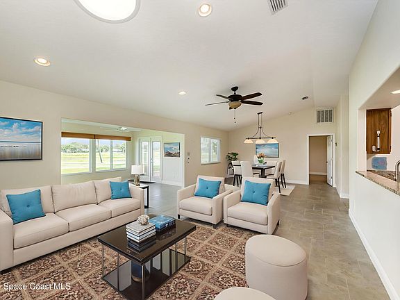 Live the ultimate Florida lifestyle in this popular Raleigh model, perfectly situated in a resort-style country club community with top-tier amenities. This 3BR/2BA open-concept home features quartz countertops, SS appliances, and impact windows. Enjoy morning coffee in the Florida room with breathtaking golf course and water views, or relax on the screened lanai. 2020 roof, stylish staggered tile floors, and river rock landscaping add to the charm. Home to over 600 Military Veterans, Indian River Colony Club is a Private 55+ Country Club community with an extensive maintenance program for each home. It includes an18-hole golf course, fine dining restaurant with an executive chef & the 19th Hole restaurant and bar, fitness center, heated swimming pool, tennis courts, croquet, bocce ball, shuffleboard, and more. Pet-friendly, gated community with over 60 activities groups that have you feeling like you are on vacation.