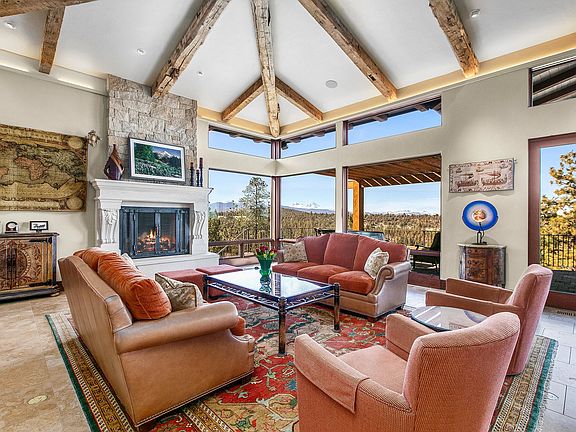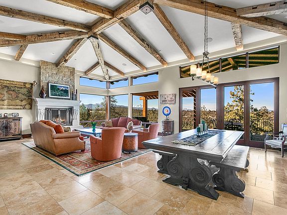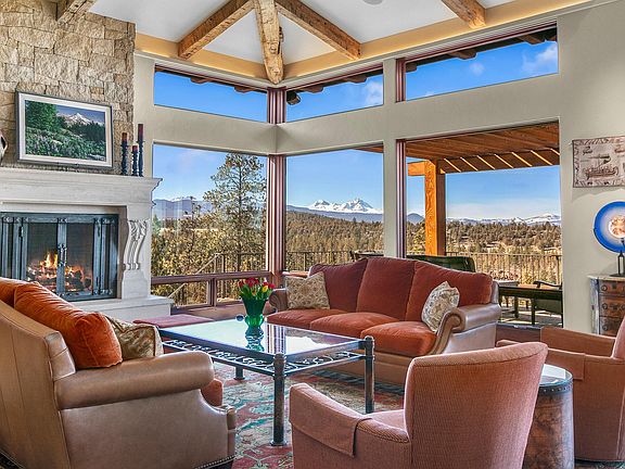 Majestic Cascade Mountain Views & the peaceful sound of the Deschutes River below complement the luxurious interiors of this spectacular residence. Wood & stone accents blend w/ the natural scenery surrounding the 1-acre property, ideally positioned in the exclusive North Rim community. Home embodies rustic elegance, w/ hand-hewn timbers, entry foyer accentuated by stone columns & 17' ceilings leading to 2-story great room w/ vast picture windows & deck overlooking panoramic mountain views.Main level primary suite offers private deck & hot-tub from which to enjoy the mountain views, sunsets & the rising sun. Main level also inc. 2nd primary suite; library overlooking garden courtyard; mtn view chef's kitchen; dining room w/ fireplace; study w/ access to 2nd courtyard w/ fireplace. 2 guest suites, family room w/ kitchenette, mountain view terrace & 2nd laundry up. Lower-level features rec room, workshop & gym w/ access to outdoors & river below. Home also boasts TWO separate garages