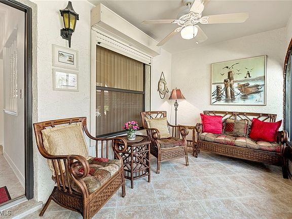 Highly desired corner pool villa is ready for new owners to enjoy. Rear lanai facing south. Floorplan offers enclosed front and back lanai with skylight, pocket sliders, and interior laundry. Walk out to the courtyard pool from the back lanai to a tropical landscaped setting within this pool villa section of the community. The pool villas are a great way to socialize with neighbors. Community has activities director throughout the year. Yes, there are pickleball courts. Close to Sanibel and Fort Myers Beach. Air conditioner and water heater new October 2022. Fridge, Stove, Dishwasher, Washer and Dryer replaced in 2022. Carport and storage locker included. Back lanai adds 136 sq ft to living area with sliders open. Maintenance fees include master association and flood insurance.