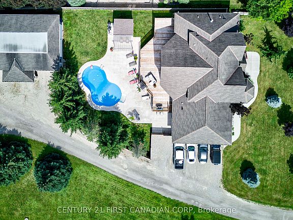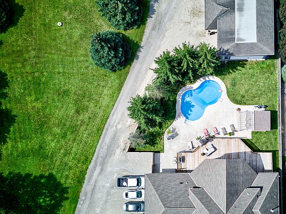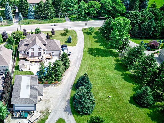 Experience exceptional craftsmanship and modern luxury in this custom-built home, constructed entirely with ICF (Insulated Concrete Form) from the footings to the roof peak for unmatched strength, energy efficiency, and durability. This 5-bedroom, 4-bath home offers over 5,600 sq. ft. of finished living space, an inground saltwater pool (2019), and a 30x50 heated shop, the perfect blend of elegance and practicality. Inside, you'll find heated floors throughout and countless upgrades. The Great Room impresses with soaring 26-ft ceilings, cedar plank accents, and a stunning custom stone fireplace with solid maple mantels. The gourmet kitchen features Italian granite countertops, stainless steel appliances, and custom cabinetry. The Primary Suite is a true retreat, complete with a double-sided fireplace and a spa-inspired ensuite featuring a steam shower and a self-purging Roman tub. Upstairs offers a spacious loft and flex area, plus a bedroom and full bath. The lower level is fully finished with 9-10 ft ceilings, a second kitchen, two bedrooms, and a full bath, ideal for multi-generational living or as an in-law setup. This home truly has it all. Schedule your private showing today to experience this one-of-a-kind property. Full feature booklet available.