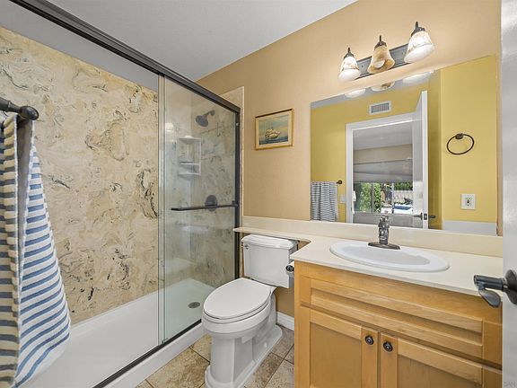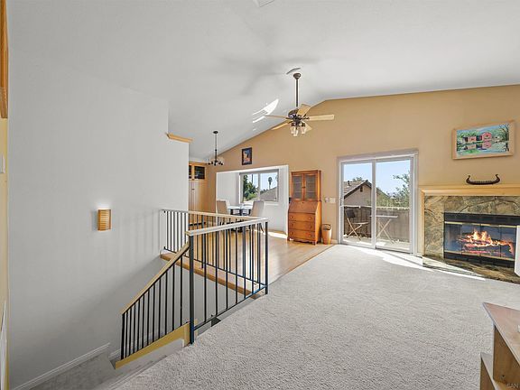 Welcome to this beautifully updated home in the highly desirable gated Cimarron community. As you enter, you’re greeted by an open-concept living space with soaring ceilings and windows that overlook stunning canyon & mountain views. The living room, complete with a cozy fireplace, flows into the dining area and upgraded kitchen featuring granite countertops, stainless steel appliances, & recessed lighting. A conveniently located bedroom and full bathroom complete this level. Downstairs, the spacious primary suite offers a walk-in closet, a full bathroom, & direct access to the backyard. A third bedroom and additional full bathroom are located down the hall, along with a generous storage area — perfect for keeping everything neatly tucked away. Cimarron provides a peaceful and private setting with resort-style amenities including a pool, clubhouse, tennis courts, fitness center, & scenic trails. Ideally located just minutes from Daley Ranch, Lake Dixon, shopping, dining, and closest beach is 25 mins away! HOA fees include trash service!