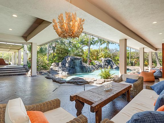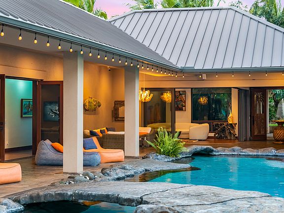 This majestic tropical estate is a rare, private sanctuary! As soon as you drive through the custom exterior gates, down the palm tree lined driveway and pull under the porte cochere, it's clear that this property is something very special. The carved entry doors open to a stunning pool with cascading waterfalls. This is indoor/outdoor living at its finest! Generous covered lanais lead to the interior spaces which feature hand carved doors and grass cloth vaulted ceilings. An open kitchen features high end appliances, custom cabinets and a huge island offering abundant counter space and seating. The main house features 6,046 s.f. of living space with 5 bedrooms and 7 bathrooms. The ground level, private owner's suite features luxurious his and her bathrooms. Above the master is an office with ocean/garden views, half bath and a large wrap around deck. There are 4 bedroom suites and 3 bathrooms in the wing above the over-sized 3 car garage. The 2 acre property is extremely private with lush landscaping and a video/security system. A 2 bedroom/1 bath Ohana with 2,312 s.f. of living space is discreetly located behind mature palms with its own entry gate and driveway. At ground level is a fully furnished gym with a yoga area, cold plunge and barrel cedar sauna. Interior decorated by former Ralph Lauren and Maui designer, Tim Tattersall, this property comes furnished with high end furniture and artwork creating a “Vintage Hawaiiana” experience. A minor list of exclusions to be provided. This property is located in the highly sought after Haiku Makai neighborhood, only minutes to Haiku town with its restaurants, grocery and post office. It's 5 minutes to world class Hookipa beach, 10 minutes to Paia, and 7 miles to Kahului Airport. Arrange your private showing today! Under contract but open to back up offers!