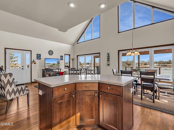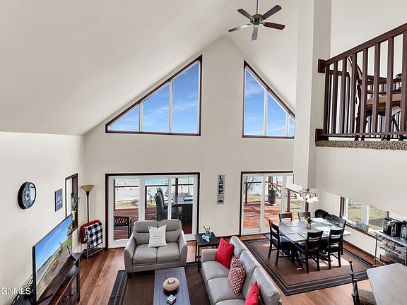 This well-maintained home features a vaulted ceiling, scenic panoramic views through the wall of windows overlooking the water and loft-style second room overlooking one of the highest views across the awe-inspiring Brush Lake.
