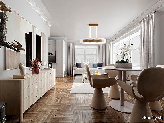 The moment you enter, you're bathed in southern and western sunlight that spills, shimmers, and settles across polished hardwood floors like liquid gold. Six stately windows stand tall, framing the ever-changing city as warmth and brightness waltz through the room, featuring direct stately Empire State Building and stunning sunset views. Comfort is quietly constant, with through-the-wall A/C and heating ensuring that every season feels like home. Your sleeping alcove, perfectly fitted for a Murphy bed, becomes a cocoon of calm after the city's daily symphony. Step into your spa-inspired bathroom, where a steamy-hot shower hisses to life--a soothing sonnet of water and warmth that melts away the Manhattan rush. This home balances beauty with practicality--a rare duet. Your open kitchen gleams with stainless allure and generous storage, beckoning both the culinary novice and the gourmand. Three large closets stand like sculpted sentinels of order, keeping chaos contained and serenity sustained.