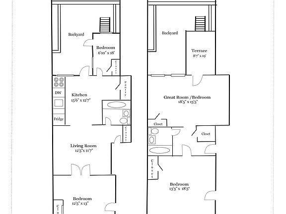 This duplex home is both practical and purposeful. Solid northern and southern exposures. ALL 4 bedrooms are situated on opposing sides of each floor, and include their own built-in closets and overhead fan light fixtures. The upstairs parlor level has 2 VERY rare 18' ft wide or long SUPER oversized bedrooms, towering ceilings and original doors, and crown molding. Shared by both is a modern, full bath with crisp white subway-tiles, glass shower door and full tub and an adjacent hallway closet. The south facing GREAT ROOM can be used as an alternative living / studio / work space with direct access to an 8' 7" x 19" terrace with grill that descends upon that finished backyard.