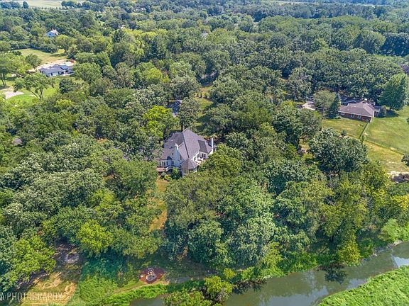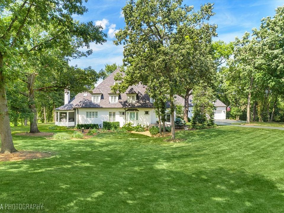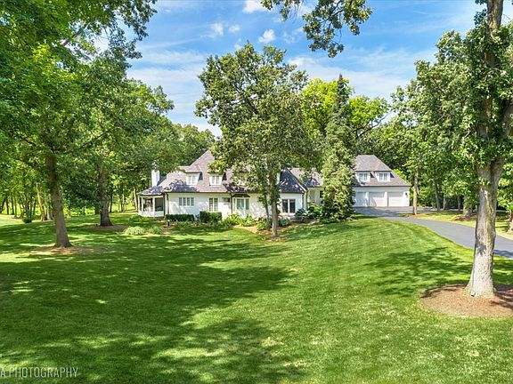 Charming French Country estate in the heart of Barrington Hills. This exquisite residence offers 5 bedrooms, 5.2 baths, and sophisticated architecture rich in classic detailing, yet crafted for a modern luxury lifestyle. Designer lighting, custom millwork, and high-end finishes are showcased throughout. A circular drive sets the tone as lush gardens, mature trees, and grassy expanses open to Flint Creek-with direct access to equestrian riding trails-creating a peaceful nature retreat just minutes to town, train, dining and District 220 schools. Inside, a dramatic two-story foyer reveals sightlines to the picturesque rear grounds and a stunning great room with soaring ceilings, gas fireplace, balcony overlook, and a triple set of doors to the deck, creating a warm family gathering space. A spectacular hexagon dining room features a vaulted wood-plank ceiling and panoramic views of Flint Creek-perfect for sophisticated entertaining. The gourmet kitchen is every chef's dream with custom cabinetry, marble counters, massive island, walk-in pantry, and top-tier appliances. Adjacent breakfast room with radiant heated floors opens directly to the expansive deck for morning coffee or alfresco dining. The main floor primary suite is a private sanctuary with spa bath (steam shower + soaking tub), dual custom walk-in closets, a large sitting room / office, and a serene screened porch allowing for one floor luxury living. Also on the main level is a second ensuite bedroom with private deck, mudroom with service entrance, two powder rooms, and laundry. The second floor offers beautiful architectural character with balcony overlook, two additional bedrooms with dormers, updated shared bath, and a flex office/nursery with skylight. A private rear staircase leads to a full guest / in-law / au pair suite with radiant heated bath. Expansive walkout lower level is built for entertaining and everyday living with a huge recreation room with fireplace, wet bar with sitting area, exercise and game rooms, and full bath. Attached, heated 3-car garage with epoxy floors and storage. A serene setting with breathtaking views of Flint Creek and the surrounding landscape where you can enjoy nature, privacy, water views, and Barrington Hills lifestyle all in one extraordinary property.
