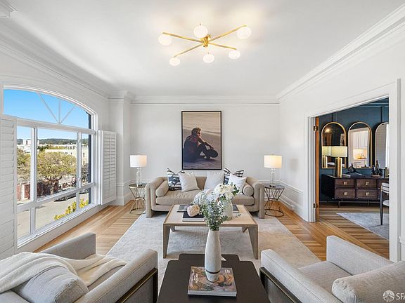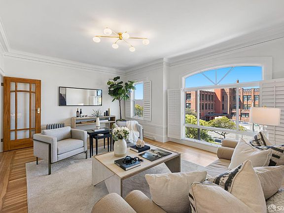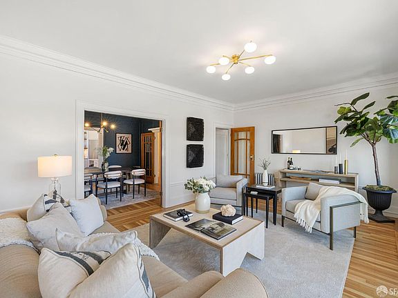 Situated in prestigious Jordan Park, this sun-filled top-floor residence combines timeless charm with modern upgrades in a boutique four-unit building. Classic SF details flow through this refined home while showcasing a thoughtful renovation and refinished Oak wood floors throughout. A generously-sized living room with beautiful, west-facing windows and crown molding transitions by way of french doors into a dramatic yet elegant formal dining room. Steps away, a luxuriously, newly remodeled kitchen featuring high-end SS appliances including gas range, sleek Quartz countertops & gold finishes. Two bedrooms including a spacious primary with custom built-in wall closet system for ample additional storage. The second bedroom has been upgraded with BredaBeds built-in Murphy bed, making transitions a breeze. A stylishly updated bathroom includes a Toto washlet along with beautiful, modern finishes. Additional features include a private oversized storage room, and the building offers a lovely, sunny shared backyard with BBQ patio plus outdoor dining area and video Doorbird intercom. Boasting a 95 Walk Score, easy access to Rossi Park, Golden Gate Park, and the Presidio. Close to Clement St. hotspots, and a few blocks to Laurel Village. Welcome home!