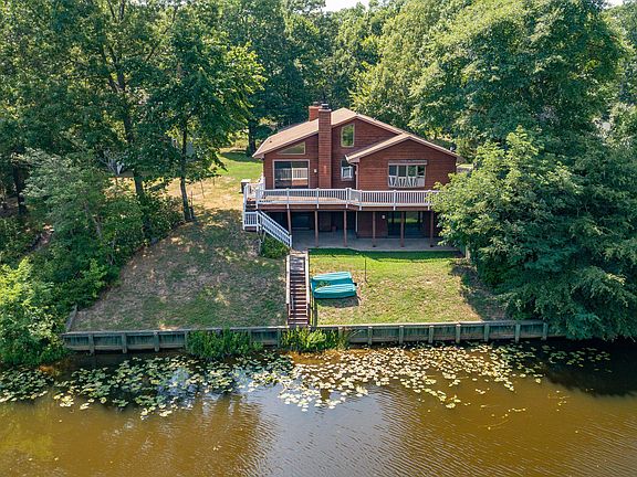 Remarkable rambler with fully finished basement backing to Placid Lake! Expansive views of the water from the all sides including Primary bedroom, living room or off the massive rear deck. This home boasts updated bathrooms and kitchen. Hardwood floors throughout main level. Wood inlay vaulted ceilings compliments the open floorplan. Full basement with in-law suite includes kitchen and full bath. Propane fed backup generator. Attached two car garage and additional two car detached garage allows plenty of room for storage and parking the toys. Don't miss this waterfront dream home, see 3D virtual tour!