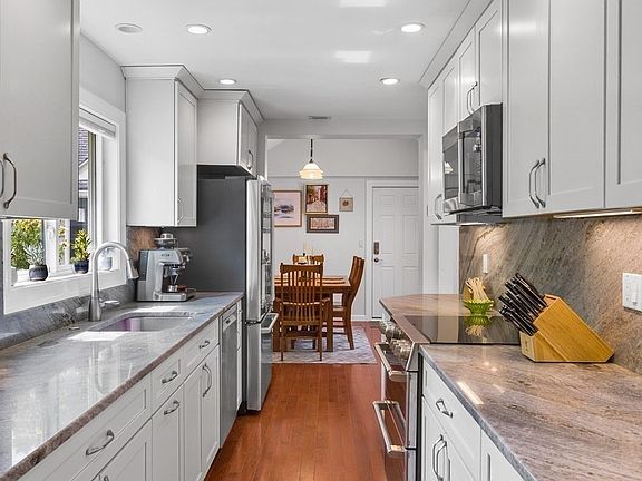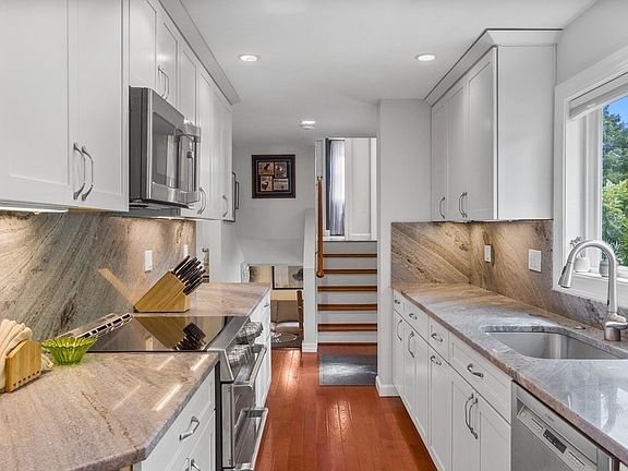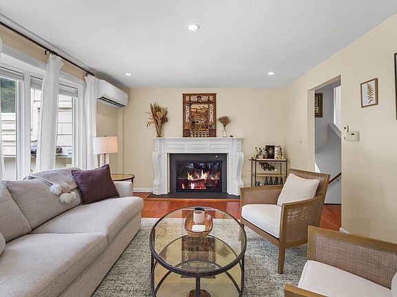Wonderful opportunity with a backyard oasis abutting conservation land. Beautifully updated and in pristine condition, this split level raised ranch offers a spacious and flexible floor plan with abundant natural light and privacy. The kitchen features new stainless steel appliances including induction range, granite countertops, backsplash slab and great connectivity to the dining and living rooms. The oversized living room is flooded with natural light with wood burning fireplace and direct access to the patio and yard. Upstairs is comprised of 3 bedrooms and 2 full baths including a serene primary suite with picture windows, walk-in closet and dressing room. The fully finished lower level features a moody family room with stone fireplace, laundry, 4th bedroom, full bath and separate entry great for guests or in-law suite. Oversized fenced-in yard with patio and convenient access to Horn Pond trails. Additional upgrades include A/C mini-splits, heated garage, and sprinkler system.