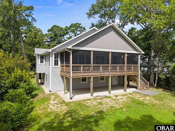 Enjoy the rare opportunity to own a pristine, almost brand new canalfront home that offers the perfect blend of privacy, craftsmanship, and coastal living. Thoughtfully designed by Jeff Sawyer and expertly built by Albemarle Construction, this like-new residence is tucked away in a peaceful setting—just minutes from the beach—offering the best of both tranquility and convenience. Spanning over 2,300 square feet, the home showcases a contemporary design with high-quality finishes throughout, including engineered wood flooring, custom designs throughout, and high quality Marvin windows that flood the space with natural light. The open-concept layout features a spacious living room with a stunning fireplace, an 84 inch TV, and French doors that frame picturesque canal views, while flowing seamlessly into the dining area and kitchen. The kitchen is a true standout, featuring quartz countertops, custom cabinetry, top-of-the-line appliances, a stylish tile backsplash, and a large bartop for casual meals or morning coffee. Just off the main living area, the large ensuite bedroom serves as a peaceful retreat with direct access to the outdoor deck and serene water views. The adjoining private bath is finished with the same modern, high-end style found throughout the home. A huge walk in, custom closet is ideal to store your entire wardrobe with ease. Two additional bedrooms are located on the opposite side of the home and share a full bathroom that mirrors the same quality and attention to detail with upscale vanity, tile floors and beautiful fixtures. A generous laundry room is also located on the main level, plenty of room for another fridge, adding everyday convenience and functionality. Outdoor living is just as impressive, with an expansive covered patio that extends the living space—perfect for al fresco dining, entertaining, or simply relaxing in the shade. Surrounding decks offer additional spots to unwind and take in the views, while the bulkheaded canal frontage provides long-term stability and low-maintenance waterfront enjoyment . The lower level includes a fully enclosed two-car garage and a large additional space with endless potential—whether you envision a home office, studio, gym, or recreational space, the open layout invites customization. Built on 120 pilings with every attention to detail and professionally landscaped with underground irrigation throughout the whole yard, this home combines lasting quality, thoughtful design, and a coveted location in Southern Shores. Whether you're seeking a year-round residence or a peaceful canalfront getaway, this exceptional property offers a rare chance to experience modern coastal living at its finest. Large back yard should offer plenty of room for a pool, but would require due diligence from buyer to confirm. Make sure to check out the virtual tour either by clicking on link or copy/paste into your browser:
