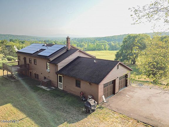Welcome to the breathtaking 166 Stanton Rd, a well maintained 4 Bed/3 Bath Split-Ranch in the heart of Coeymans Hollow. This 13.6 acre lot is stunning, with clear fields in the front of the house and wooded hills behind. As you approach the long driveway you will see beautiful Willow trees providing privacy to the home which has a large 2+ car garage, first floor or 2nd floor entries, a 2nd Story porch and an enclosed three season room. In the rear of the house you have a deck off of one of the primary bedrooms. On the first floor there are two bedrooms, one is a primary bedroom en suite full bathroom, an additional full bathroom and a living room with cozy wood stove. As you go upstairs you will enter dining room/living room area, modern kitchen with granite counter tops, a primary bedroom with balcony, bedroom and full bath. Solar Panels are leased and would be transferred with sale