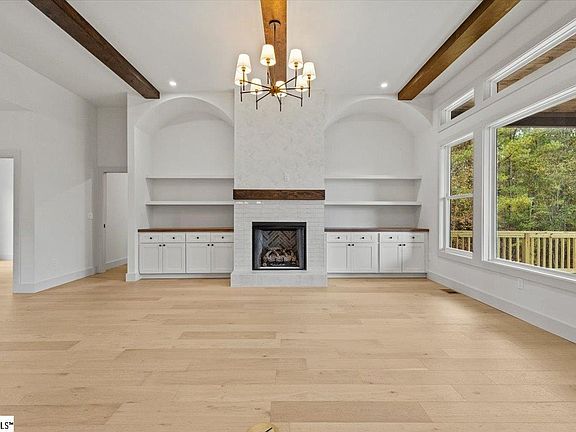 Welcome to 166 Sullens Road, Campobello, SC—a brand-new, custom build where thoughtful design and quality craftsmanship combine to create this elegant home. Nestled on 1.29 acres of slightly sloped, open land surrounded by trees for privacy and across from a picturesque pasture, this home offers the perfect balance of tranquility and convenience. Step inside to discover an open layout with tasteful light and warm engineered hardwoods throughout. The living room takes center stage with soaring 12-foot ceilings, wooden beams, and a beautiful fireplace framed by a deep brown wooden mantel and built-in cabinetry, all incorporating custom arches for a cohesive and elegant look. The kitchen is a chef’s dream, featuring custom cabinetry with warm brown tones below and crisp white above, complemented by white quartz countertops. A large island with pendant lighting adds a touch of sophistication, while the Frigidaire Gallery appliance package and a built-in coffee bar under an arched accent make this space as functional as it is beautiful. The primary suite, located on the opposite side of the home for ultimate privacy, is a restful retreat. It features a generous en-suite bathroom with a floor-to-ceiling tiled shower, overhead rain showerhead, water closet, and a spacious walk-in closet. Thoughtful sound insulation in the primary suite, bathrooms, and garage will add to the peaceful feel of daily life here. Additional highlights include an office space at the front of the home—perfect for remote work—and a large covered porch overlooking the peaceful lot, making it ideal for relaxing or entertaining. Located on a quiet road with no HOA, this home is far enough from the hustle and bustle of Greenville and Spartanburg to feel like an escape, yet just 10–15 minutes from daily conveniences on Wade Hampton and 20 minutes to downtown Greer. 166 Sullens Road is more than just a house—it’s a place where elegance meets comfort, offering a truly peaceful retreat with room to spread out. Schedule your private showing today and experience it for yourself!