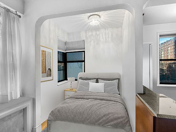 Eastern and northern exposures brighten the large living space and sleeping alcove. The windowed kitchen comes complete with a dishwasher as well as a built-in breakfast nook. The floor plan allows for open living and dining. A long, closeted hallway leads to the bathroom and is equipped with extra chests of drawers, providing ample storage.