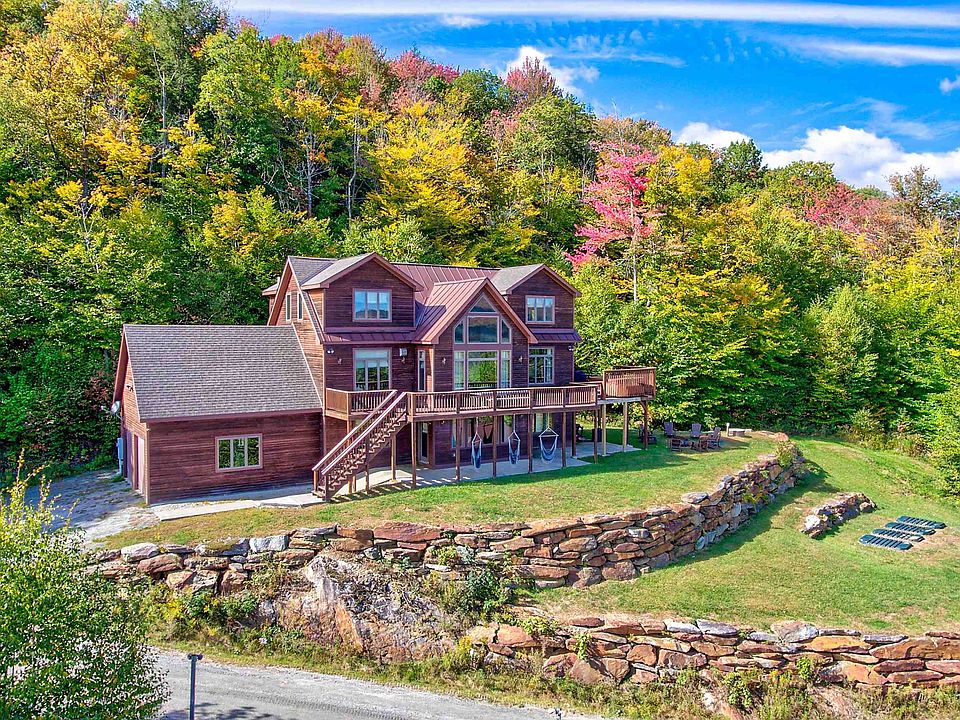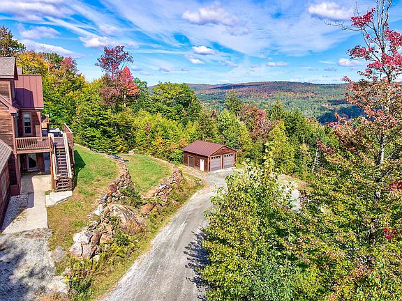 Perched high on the hillside, this home offers expansive views of the lakes and mountains. Located at the end of a quiet road in the Farm Ridge Community just under 5 miles from the base of Okemo Mountain and 4 miles to Plymouth State Park for boating and swimming in the warmer months. The maintained trails on it's 16.15 acres makes it easy to explore, while the deck is a perfect place to relax, soak in the hot tub while enjoying views of Lake Rescue. The interior of this hillside retreat boasts an expansive three-level floor plan designed for both comfort and entertaining. Large windows throughout capturing the changes of the season, gorgeous walnut flooring, a stunning great room with soaring ceilings and two gas fireplaces. This home offers plenty of room with four bedrooms—including two primary suites—plus two versatile bonus rooms that can serve as additional sleeping space or a home office. The attached oversized garage provides ample storage for all your gear, while the detached heated garage is perfect for the bigger toys - snowmobiles, boats, ATV's.