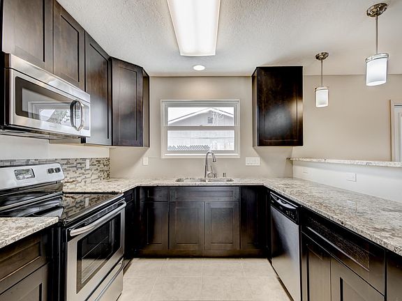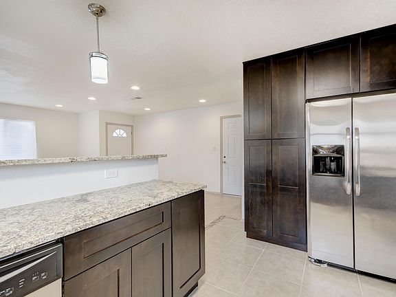 Beautifully remodeled and move in ready! The open concept layout features updated tile flooring, recessed lighting, custom cabinetry, stone counters, stainless appliances, pendant lighting over bar seating and French doors leading to backyard patios. Baths with custom tile and cabinetry, updated fixtures and primary bath with large tiled shower. Additional 2018 updates include carpet, roof, windows, finished garage with coated floor, water heater, upgraded electrical panel and side yard access. Schedule your showing today!