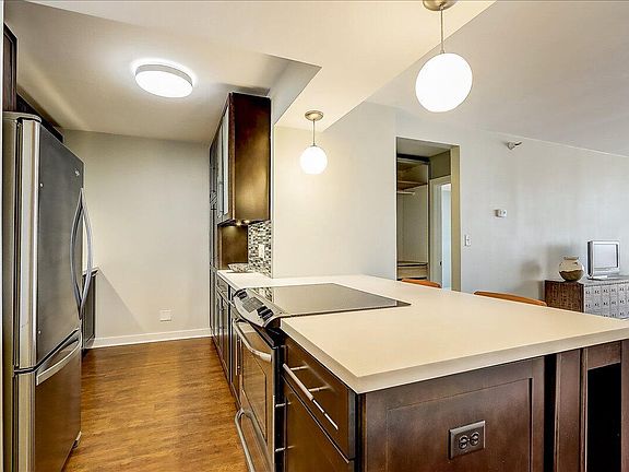 Step into this stylish downtown condo and soak in sweeping city views through floor-to-ceiling windows. Sleek luxury plank floors flow through the open-concept living space, accented by modern barn door closet. The remodeled kitchen is a showstopper with stainless steel appliances, undercabinet lighting, great storage, a breakfast bar, and dimmable pendant lights. Fresh carpet in the hallway and bedroom, both with custom closet systems. The spa-like bath features in-floor heat, a tiled shower, newer vanity, and in-unit laundry. Heat pump (2019). Storage unit + 1 heated underground parking spot included. Balcony to be painted later this year per the condo association. Enjoy having 24 hr security/concierge, gym, pool, dog run and this beautiful location to call home.