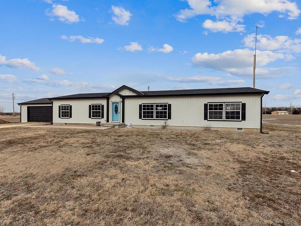 This beautiful four bedroom ranch unfolds in a quiet, country-like setting, surrounded by over three acres of your very own land. Embrace the peace of mind that comes with a new roof and gutters, plus the home is all electric. Pull up the gravel road and driveway and you'll instantly feel at home. You'll notice the fresh exterior and interior paint as you tour the home. Step inside and you'll find living areas with soaring vaulted ceilings, creating an open and inviting atmosphere, perfect for entertaining. The kitchen is a home chef or baker's dream, featuring an eye-catching stone archway over the oven/range, an expansive eating bar island, and plenty of cabinets and pantry space. All appliances are included for added convenience. The adjacent dining area connects with the kitchen, enhancing the flow of the home and ensuring plenty of space for residents and guests alike. Around the corner, there's a conveniently located laundry and mudroom, complete with a bench and coat hooks, adding practicality to daily routines. This home offers four bedrooms, including a generously sized master with a spa-like en suite bath. Indulge in the luxury of a shower, separate soaking tub, double vanity, and an exceptionally spacious walk-in closet. A second full bath with another double vanity ensures comfort for all. There's also brand new carpet all throughout the home. Step outdoors to your private oasis, surrounded by your own land in every direction. A portion of the backyard is fully fenced, providing a secure space for leisure and play. This home is located just 10 minutes away from the city center of Augusta, plus it's about 30 minutes from bigger city amenities in east Wichita. You'll get all of the luxuries of city living without all of the hustle and bustle! Don't miss out on this gem - schedule your private showing and come see it today before it's gone!