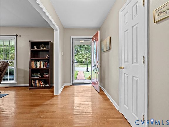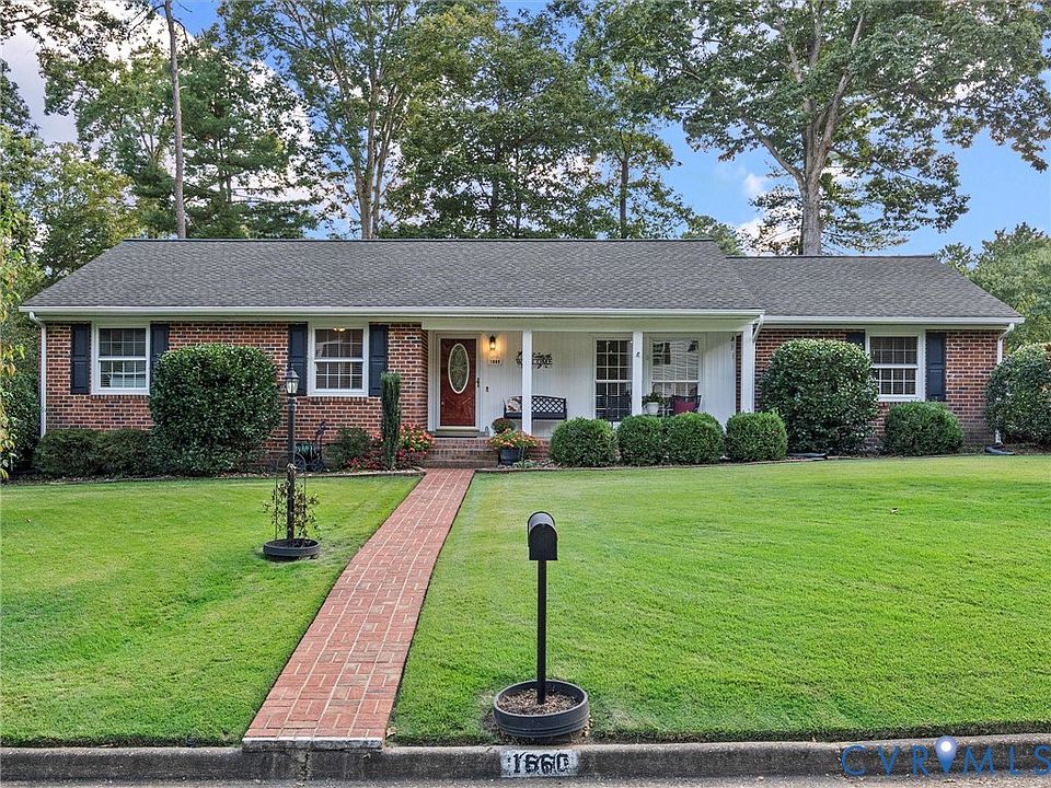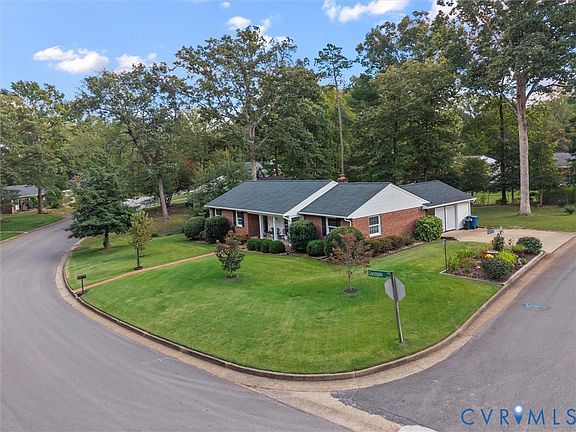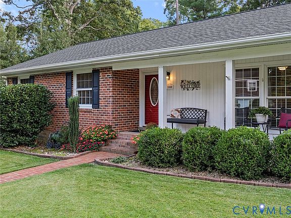 Welcome to 1660 Sandgate Rd, a beautifully maintained 3-bedroom, 2-bath ranch-style home on a desirable corner lot in Olde Coach Village! With 1,725 sq. ft. of living space, this move-in ready home offers timeless charm, thoughtful updates, and a well-kept exterior surrounded by mature landscaping. Hardwood floors flow throughout the home, with a spacious living room featuring large windows and a ceiling fan that opens seamlessly to the dining room accented with chair rail molding and decorative lighting. The kitchen boasts oversized tile floors, Corian countertops, a large eat-in island with pendant and recessed lighting, and white appliances with electric cooking. Just off the kitchen, the inviting family room includes a brick fireplace with gas insert and ceiling fan. The primary suite has hardwood floors, dual closets, and a private ensuite bath with walk-in shower and tile surround. Two additional bedrooms feature hardwood floors and double-door closets, while the hall bath includes a granite vanity and tiled tub/shower combo. The laundry/utility room offers a storage closet, pantry, attic access, and rear door to the back patio and parking area. Outdoors, enjoy a covered front porch overlooking a meticulously maintained Bermuda grass yard and a stamped concrete patio just off the carport, which doubles as a covered patio. The carport area has epoxy flooring and access to a workshop with double doors, workbench, and overhead storage. A propane tank fuels the fireplace, and the smart electric hot water heater allows remote temperature control and maintenance alerts. Additional highlights include a 30-year dimensional roof (2022), HVAC system (2016), double-width paved driveway, gutters, shutters, composition roofing, and a crawl space foundation. Lovingly maintained, this home offers single-level comfort in a peaceful, established Midlothian neighborhood—minutes from shopping, dining, and top-rated schools.